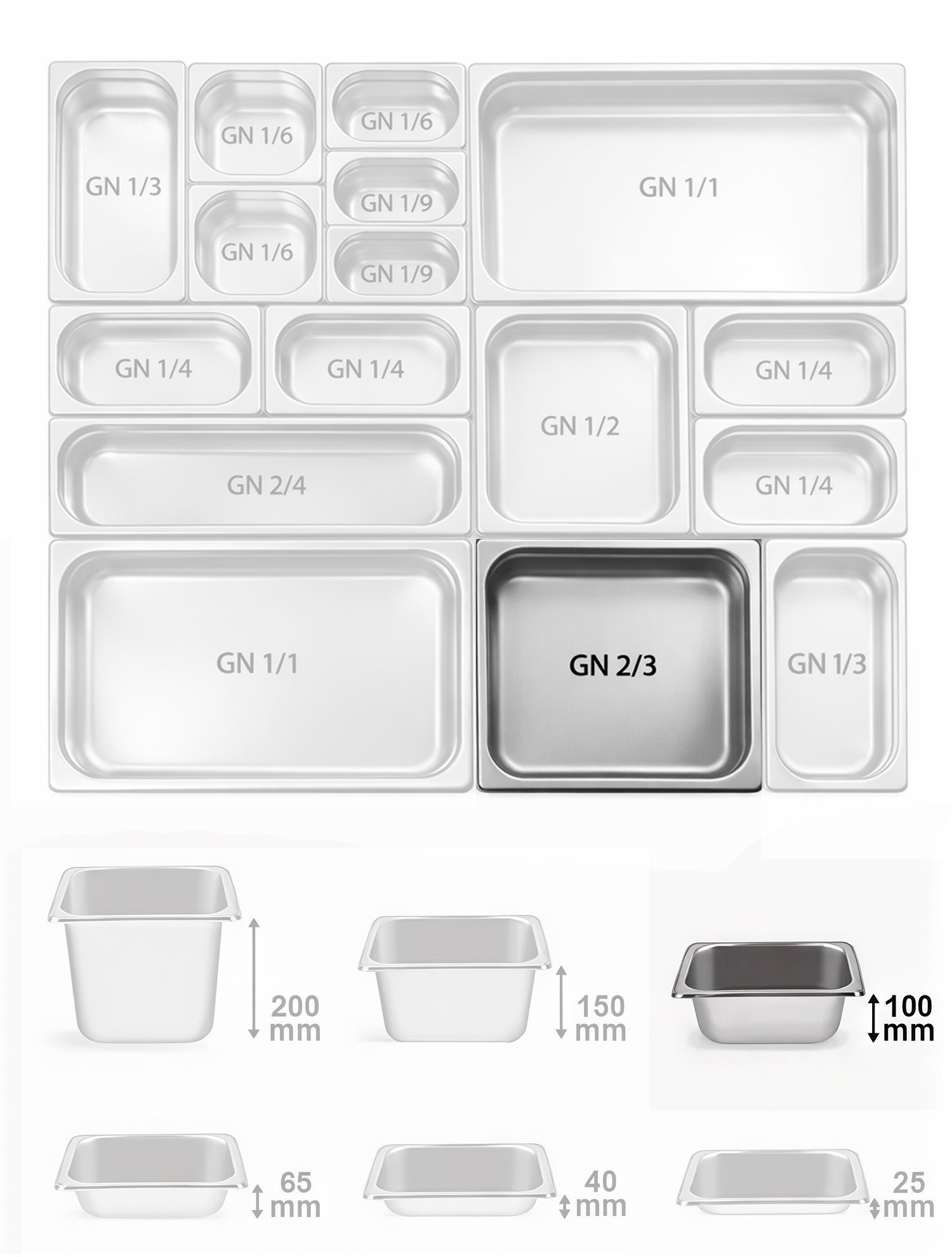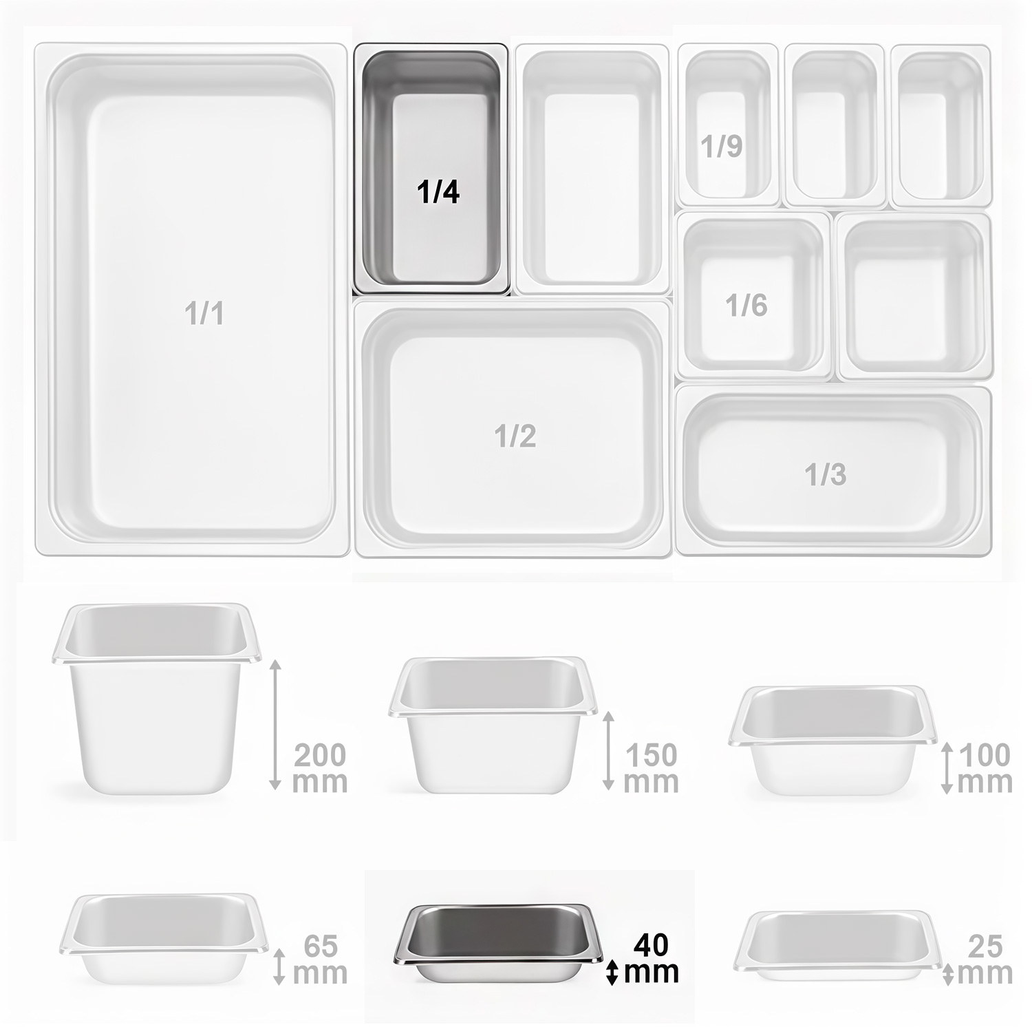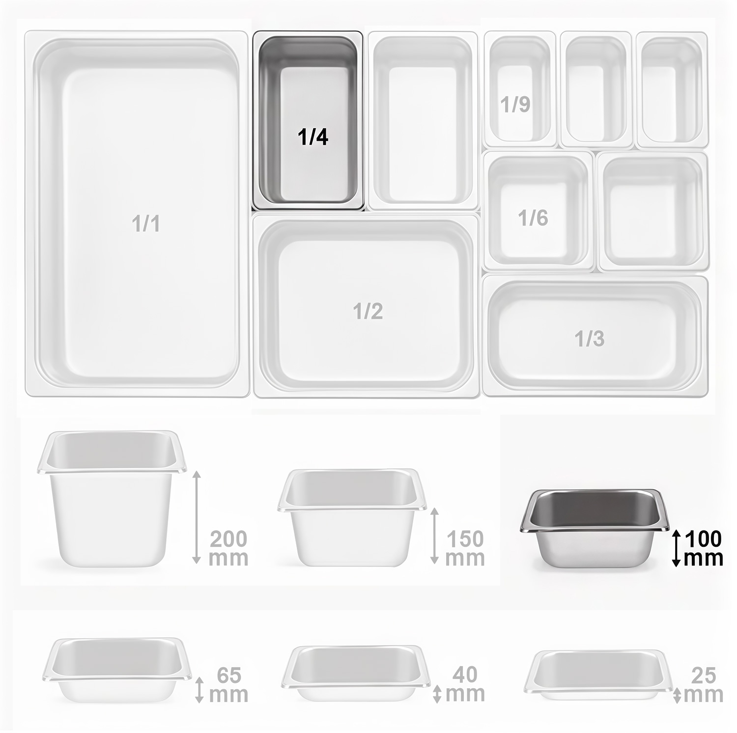 Гастронормированные размеры являются унифицированными для выпускаемого профессионального кухонного оборудования и инвентаря.Предлагаются гастрономические ёмкости (гастроёмкости) из нержавеющей стали,полипропилена и поликарбоната.