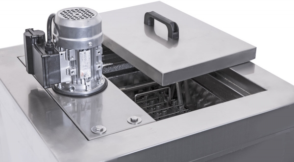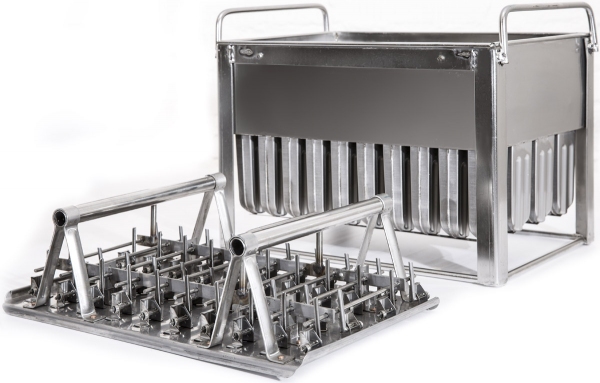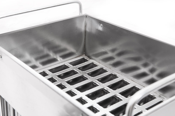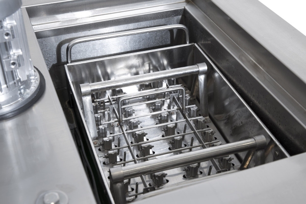 Корзина разделенная на 40 порций с дозированным соком или молоком опускается в ванну с пропиленгликолем, где при температуре -30 градусов Цельсия жидкость замерзает.