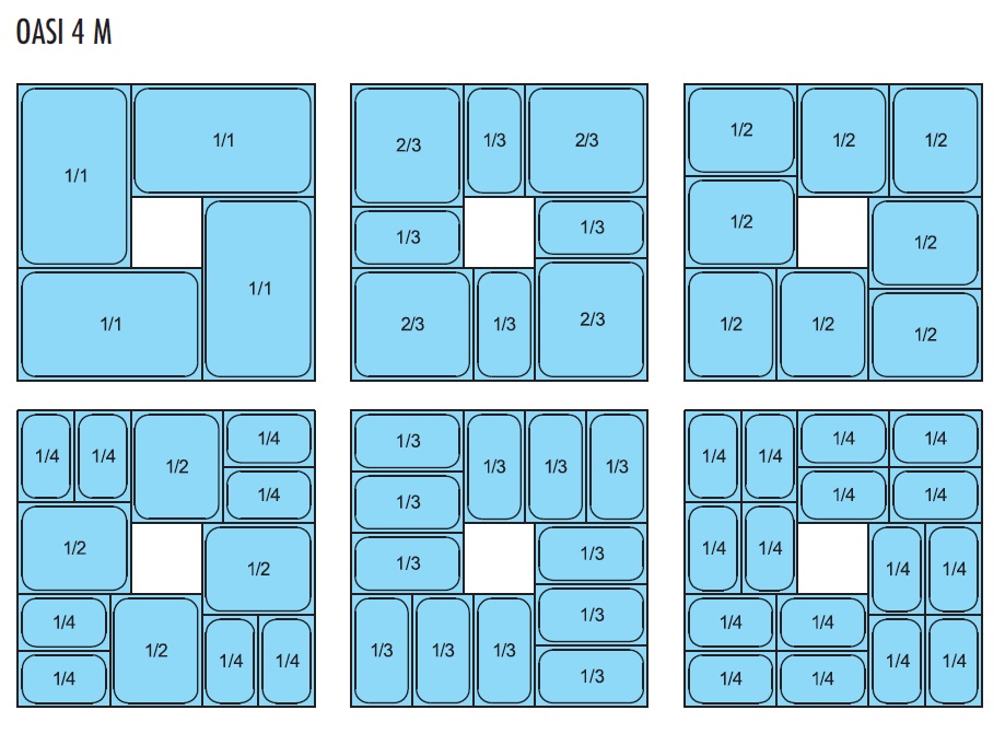 Гастроемкости поставляются отдельно, возможна установка гастроемкостей GN 1/4 - 1/3 - 1/2 - 2/3 - 1/1 - 2/1 с максимальной высотой 15 см и минимальной высотой 10 см.