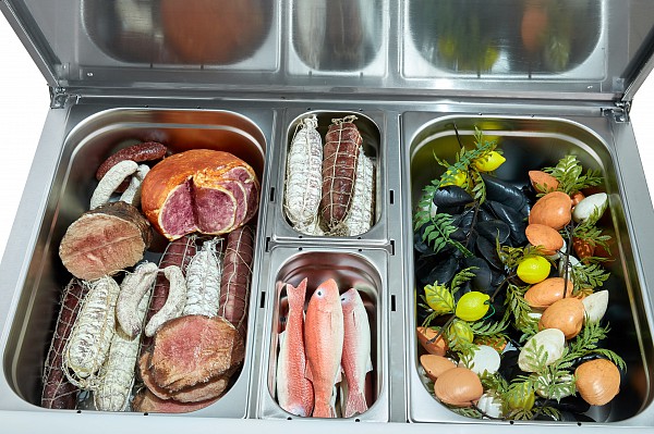 Конструкция стола обеспечивает охлаждение продуктов, не только находящихся в его внутреннем объеме, но и размещаемых в гастроемкостях 2хGN1/1 и 2xGN1/4 (поставляются дополнительно), установленных в отверстие столешницы.