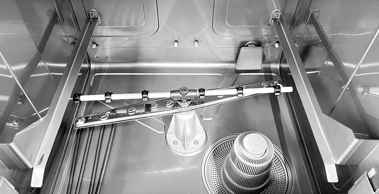 Стаканомоечная машина с производительностью 30 корзин/час с дозатором ополаскивателя, без дозатора моющего средства.