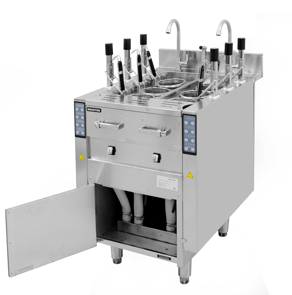 Макароноварка (паста-бойлер) напольная с автоматическим опусканием и подниманием 6 порционных корзин диаметром 13,5 см и глубиной 15 см с термоизолированными ручками и зацепами.