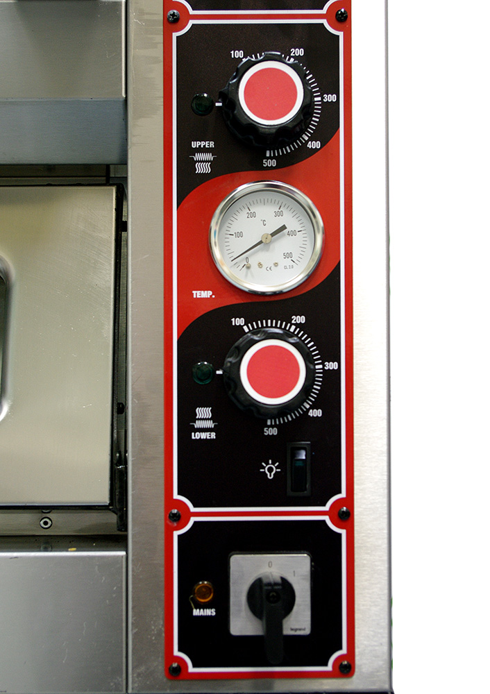 Аналоговые термостаты от 100 до 500 градусов Цельсия для установки температуры в верхней части камеры и пода; термометр; кнопка включения подсветки;общий выключатель сети.