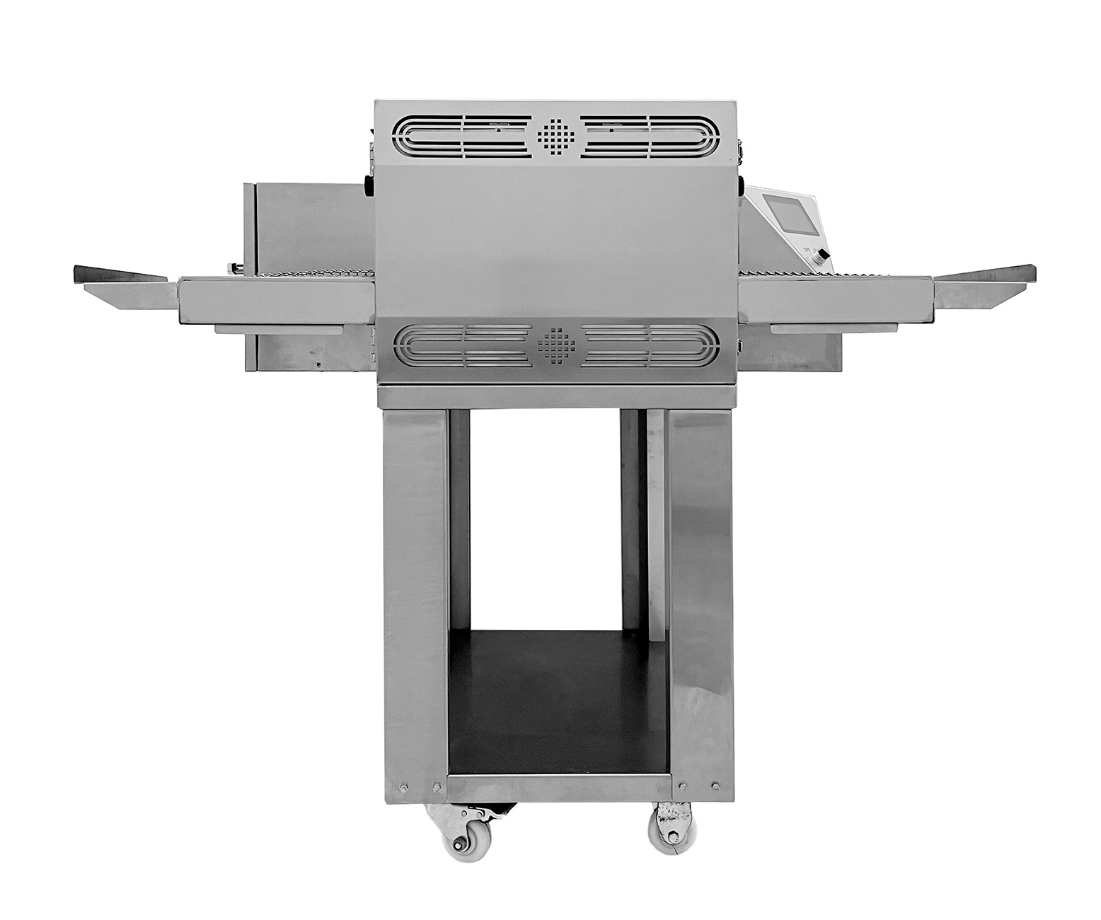 Сенсорная LCD панель управления на английском: термостат до 300 градусов Цельсия, таймер от 2 до 25 минут, память на 46 рецептов, возможность изменения направление движения конвейера, ECO режим экономии электроэнергии.