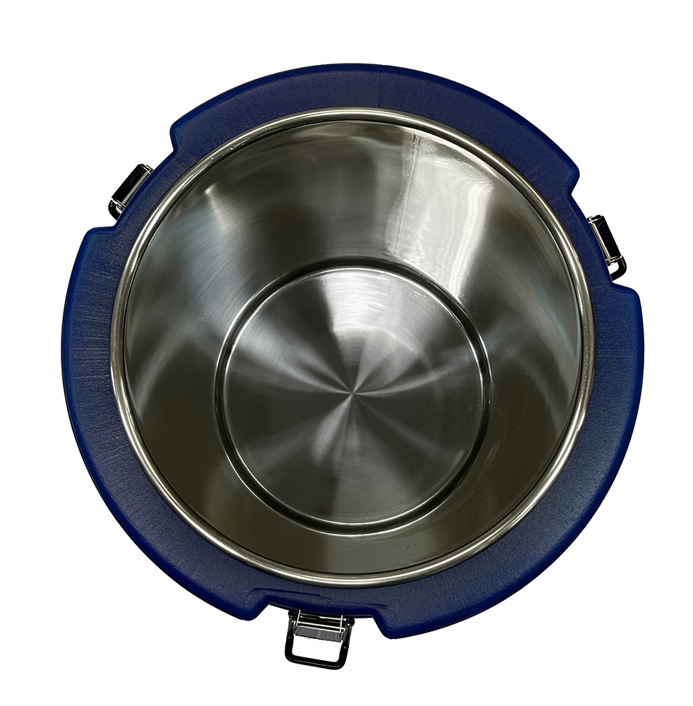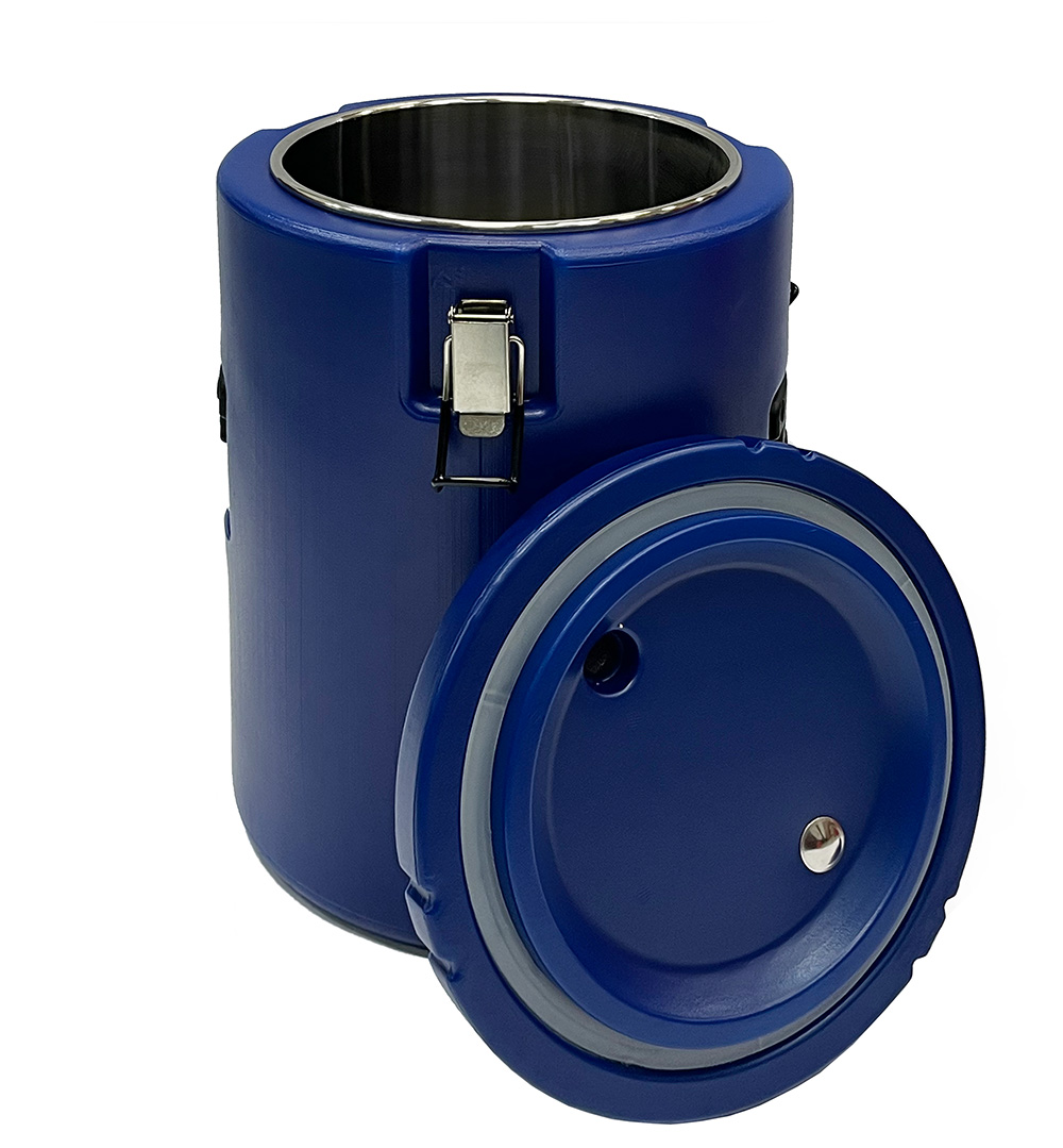 Термоконтейнер цилиндрический с верхней загрузкой с максимальным рабочим объемом 16,3 л из цельнолитой двухслойной конструкции с инжекцией из пенополиуретана высокой плотности.