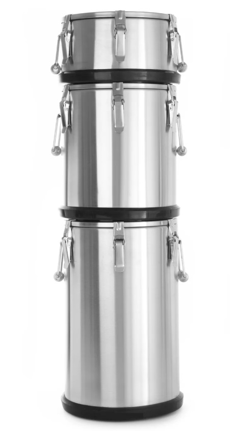 Термоконтейнер цилиндрический объемом 25 л с верхней загрузкой, изготовлен из нержавеющей стали с инжекцией пенополиуретана высокой плотности.