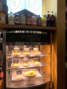 Хорошая витринка, продаем пироги. Есть рекламная панелька с подсветкой, можно выставлять температурный режим.