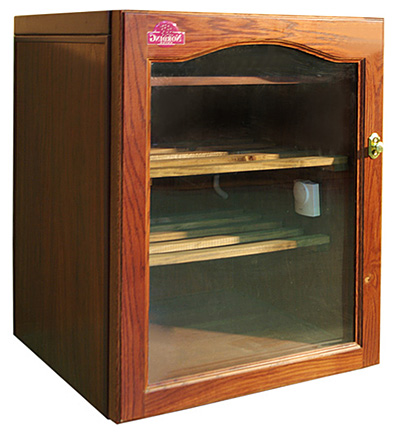 Позолоченные термостаты и гигрометр показывают текущую температуру и влажность в шкафу.