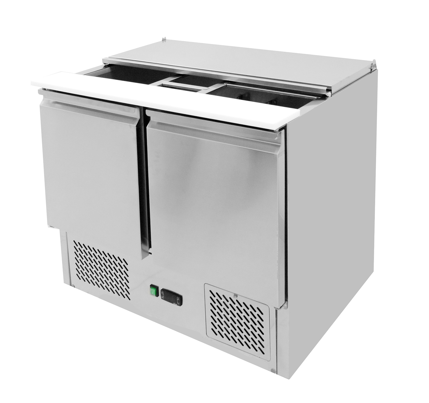 Стол холодильный саладетта из нержавеющей стали с поднимающейся столешницей.