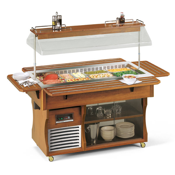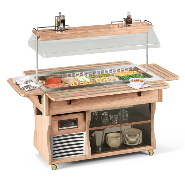 Салат-бар из нержавеющей стали, отделка из натурального дерева.