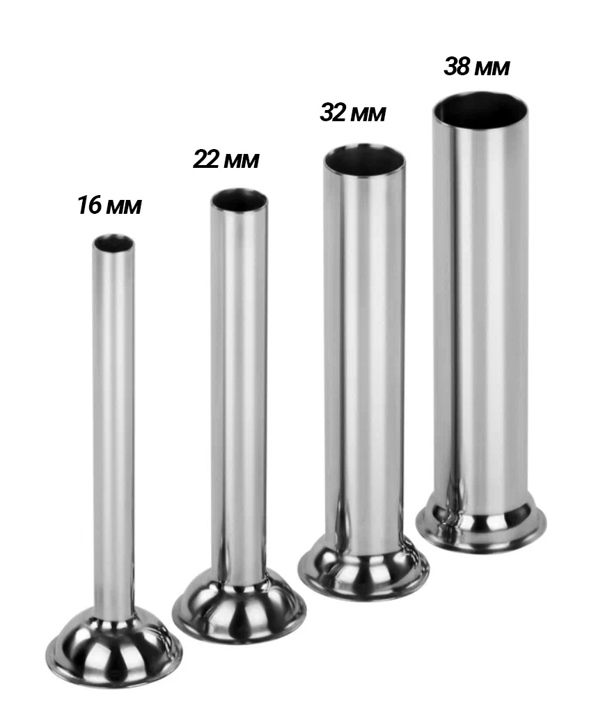 В комплекте поставки четыре воронки-цевки из нержавеющей стали AISI201 с входным диаметром 16, 22, 32, 38 мм.