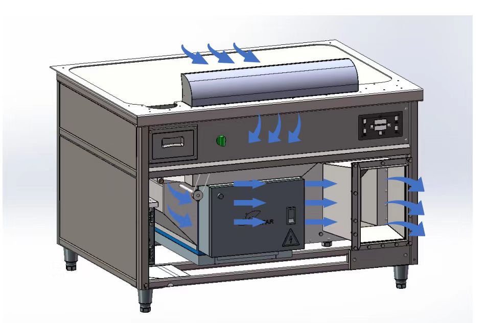 Теппан индукционный напольный с 1 зоной нагрева и со встроенной системой вентиляции.