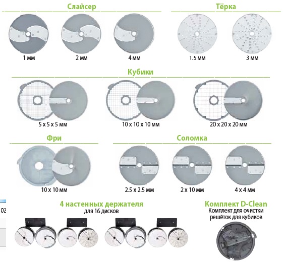 Включает в себя диски слайсеры (1 мм, 2 мм, 4 мм), диски терки (1,5 мм, 3 мм), комплекты для кубиков ( 5*5*5 мм, 10*10*10 мм, 20*20*20 мм), комплекты для фри ( 10*10 мм), диски для соломки ( 2,5*2,5 мм, 2*10 мм, 4*4 мм), 4 шт.
