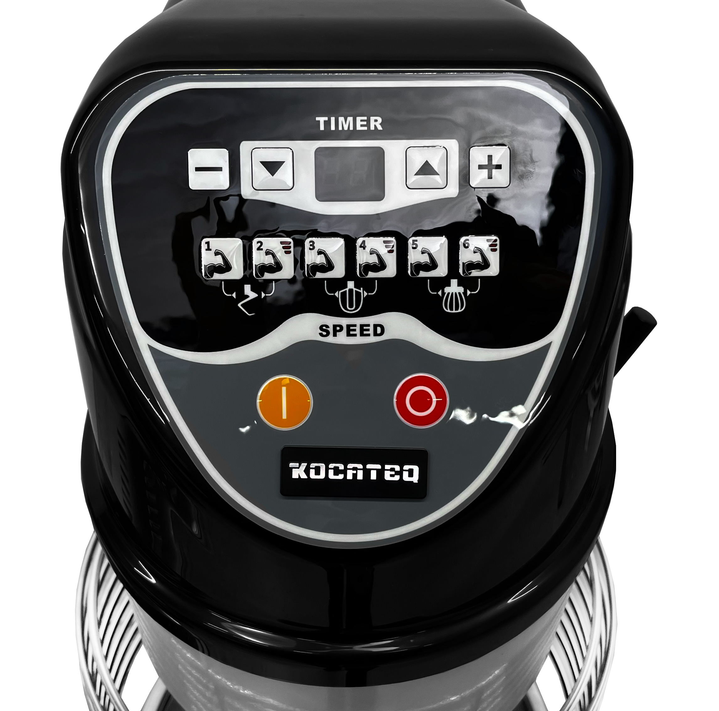 Электронная панель управления с 6 скоростями, визуально разделенными для замеса крюком, лопаткой и венчиком.