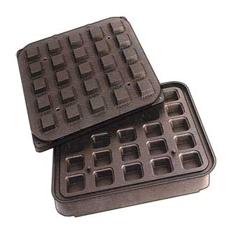 Форма G для производства тарталеток для машины Cookmatic представляет собой две пластины, одна из которых имеет выемки, а вторая выпуклости.