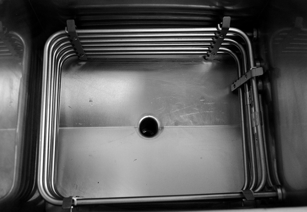 Приподнятые над рабочей поверхностью края рабочей емкости для исключения разливания фритюра на стенки жаровни и пол.