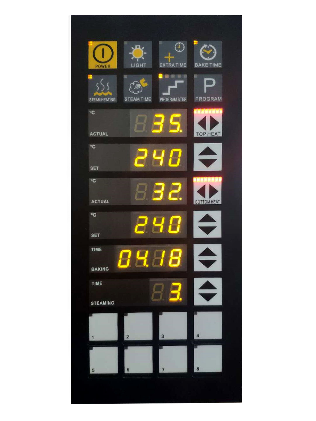 Электронная панель управления для индивидуального программирования на 8 программ (до 5 шагов в каждой) позволяет устанавливать температуру в зоне верхних и нижних ТЭНов в интервале от 20 до 300 градусов Цельсия, регулировать мощность этих ТЭНов с шагом 12,5 %, а также момент и длительность подачи пара.