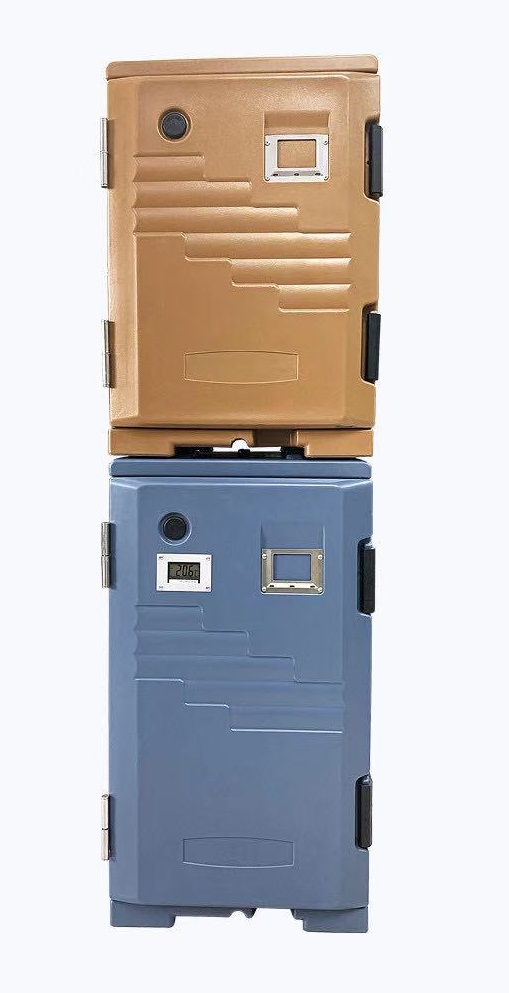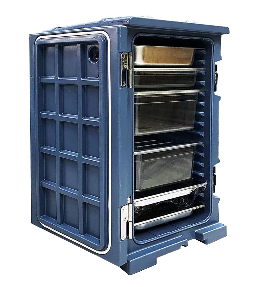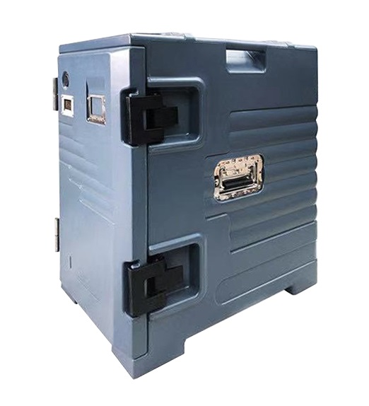 Термоконтейнер с фронтальной загрузкой объемом 115 л из цельнолитой двухслойной конструкции из пищевого полиэтилена толщиной 3 мм с инжекцией пенополиуретана высокой плотности.