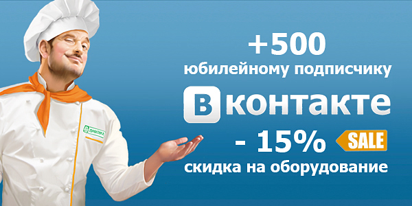 Хотим сообщить Вам, что 500-му подписчику нашей официальной страницы "В контакте" мы дарим скидку -15% на все пищевое оборудование. Имя счастливчика будет опубликовано в ленте новостей "В контакте", следите за итогами!
