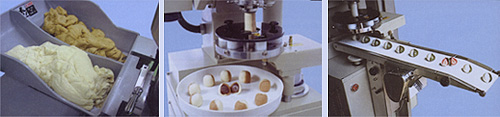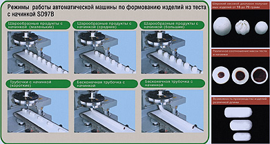 Использование защипывающей диафрагмы автоматически совершающей перемещения в вертикальной плоскости (вниз-вверх) позволяет получать продукты с начинкой различной формы – от круглых шариков, до палочек.